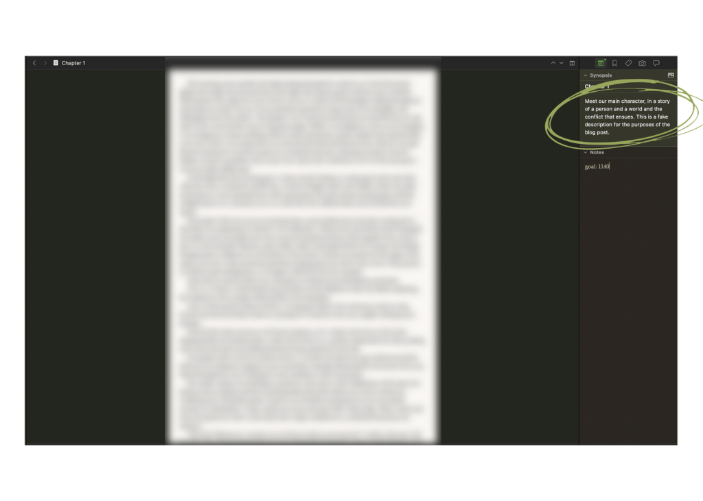 In each chapter, I go ahead and post the outline words into the little “synopsis” section off to the side. This lets me know my intentions for each chapter, and also makes sure that after I’ve put in the work, I can make sure that the chapter matches the main ideas without having to pull up the outline doc again.